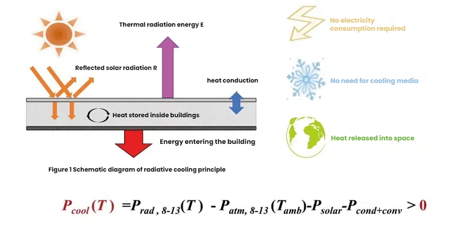 Yuanjingang Radiant Cooling Coating utilizes the thermal radiation properties of specialized materials to achieve a cooling effect. This coating reduces temperatures without consuming any energy. The principle is shown in Figure 1. This coating emits heat away from the Earth via infrared waves in the 8-13μm range, reflecting the vast majority of solar radiation. Ultimately, this reduces heat dissipation to a level greater than heat gain, resulting in a cooling power rating greater than zero, thus achieving cooling.